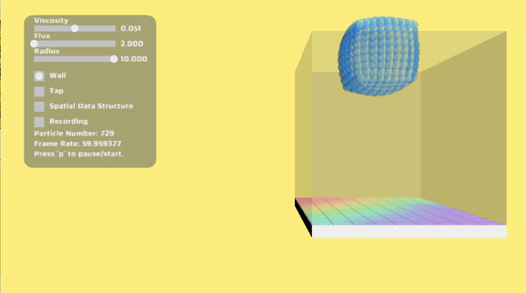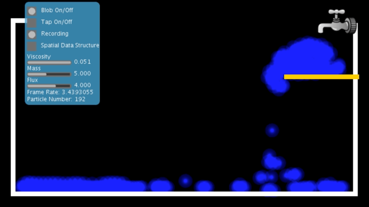 Functions in control panel: Users could adjust the radius of particle, viscosity, and flux of water tap in the control panel. Users also could control the water tap on and off by clicking the checkbox.